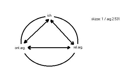 Das relationale argument hat wie das ontologische das zirkelargument zum fundament. In der denkfigur des ich kann der verfechter des relationalen arguments nur auf die dinge seiner welt zurückgreifen, damit kann er dem zirkel als seinen schatten nicht entkommen. Aber der verfechter des relationalen arguments hat eine andere perspektive auf das problem. Er benennt offen den zirkel als seine entscheidung, für die er allein und autonom verantwortlich ist, und von der er nicht ablassen kann, es sei, er gibt sich selbst auf. Der verfechter des ontologischen arguments muss seinen zirkel verbergen in der hoffnung, dass die verbergung nicht entdeckt werde; in seiner hoffnung auf nichtentdeckung aber hat er dem aufdecker der verbergung sich schutzlos preisgegeben.
