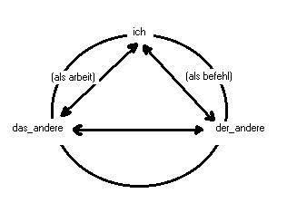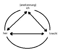 Die linearität des hegelschen modells breche Ich auf, indem Ich die drei momente: 'ich, herr und knecht', im modell zu einem dreieck verknüpfe und diese in einem kreis zusammengeschliesse; das moment: anerkennung, ist als leistung des ich verortet: