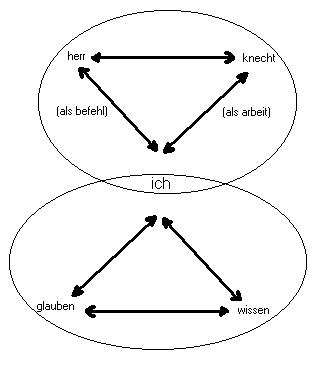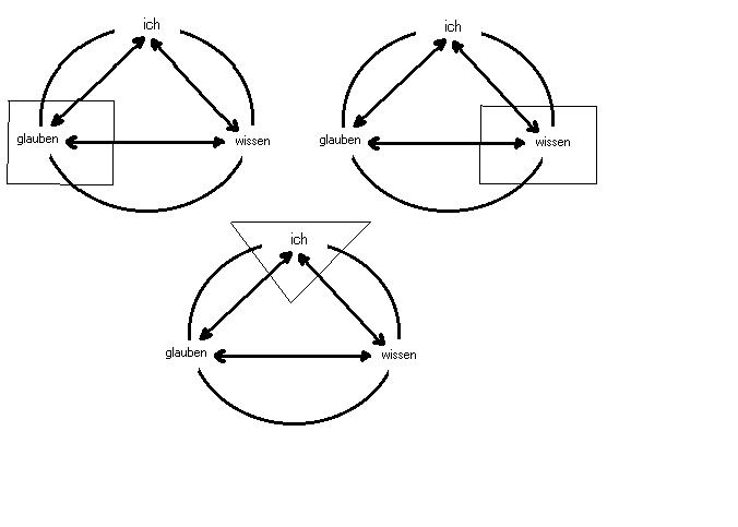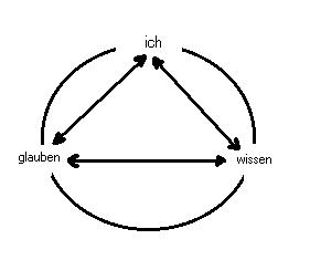 glauben und wissen im trialektischen modell der dialektik.syntheseAnalog zur strukturanalyse der herr/knecht-metapher fasse Ich die paarbegriffe: glauben und wissen, als eine relation auf, die als verknüpfendes drittes moment das ich ausweist, das einerseits etwas glaubt, andererseits bestimmtes auch weiss. Das resultat ist ein tableau von 3 relationen: