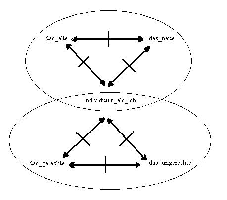 So verschieden die dialektik der begriffspaare: das gerechte/das ungerechte und das alte/das neue, in der realität auch erscheinen mag, in ihrer struktur sind die begriffe gleich. Das bestimmende moment ist jeweils im anderen begriff festgelegt. Ich bezeichne begriffe dieser struktur mit dem terminus: relationsbegriff(04). Die termini: das alte und das neue oder das gerechte und das ungerechte, verweisen zwar auf etwas, aber sie haben als zeichen für sich keine bestimmte bedeutung. Erst wenn diese termini mit den phänomenen und begriffen des alten und neuen oder des gerechten und ungerechten verknüpft werden, wird den termini eine bestimmte bedeutung zugeordnet, die sowohl für die begriffe als auch für die phänomene konstitutive momente sind. Diese bedeutung ist aber weder aus dem zeichen noch aus den bezeichneten begriffen und phänomenen ableitbar, ihre bedeutung wird von einem individiuum als ich gesetzt, und diese setzung fixiert das individuum als ich in einer relation, die es mit den dingen seiner welt hat. In der klassischen dialektik, die traditionell das alte dem neuen, das gerechte dem ungerechten zweiseitig entgegensetzt, erscheint ein drittes moment, das individuum als ich, das der entgegensetzung von alt/neu und gerecht/ungerecht ihren unverwechselbaren sinn gibt(05).