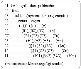 (*1) argument: //==>2.23.14/(b) und auf kurzem weg: argument: //==>2.23.14/(//==> 2.02). (a)<==//von beginn an hatte Ich den subtext als konstitutiven teil des projekts: das_politische, konzipiert. Leitend war die vorstellung, den komplexen stoff, die phänomene des politischen prozesses, auf subtext und text aufzuteilen. Die schiere menge der phänomene legte die teilung des stoffes nahe und mit seiner austeilung in text und subtext war auch die zeit verfügbar, die komplexen sachfragen in der analyse getrennt zu bearbeiten. In der struktur der argumente ist diese kompositionsweise nachvollziehbar(01). Der subtext erscheint als eine rhapsodie unterschiedlicher themen, die allein im begriff: das_politische, ihr verknüpfendes moment haben. Diese struktur der argumente ermöglicht es einerseits, den subtext als ein kaleidoskop unterscheidbarer sachfragen zu rezipieren, andererseits ist im text das verknüpfende band zur hand, das die vielfalt der sachfragen zusammenbindet. Jedes argument im subtext kann als eigenständiger text rezipiert werden, ohne auf den text oder ein anderes argument im subtext zurückgreifen zu müssen.(c)