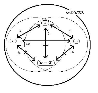 Zusatz. Im schema ist die wechselseitige relation: A<==>B, in einer klammer eingefügt. Die relation ist mit der zahl: (4), gekennzeichnet, sie hat aber nicht die funktion einer 4.relation und markiert lediglich die relation: A<==>B, die als spiegelbild((A<==>B)=(B<==>A)), different erfahren wird(cf.graphik: 062b).