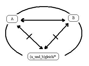das individuum als ich: A, und sein genosse: B, werden nur mit den buchstaben: A und B, bezeichnet; ebenso der beobachtende dritte: C, mit dem buchstaben: C. (a)<==//(b)die graphische darstellung ist auf die analyse beschränkt. Die synthetisierenden folgerungen, die mit dem analytischen resultat verknüpft werden können, sollen ausser betracht bleiben. Welchen nutzen die resultate der analyse haben sollen, das muss der adressat für sich beurteilen. (b)<==//(c)die formel der relationen: A<==|==>(A<==>B) und B<==|==>(B<==>A). (c)<==//(d)das moment: die_welt, wird mit dem zeichen: die_welt(=gemeinsam_geteilt), bezeichnet. Der gebrauch des zeichens ist auf dieses argument beschränkt. (d)<==//-------------