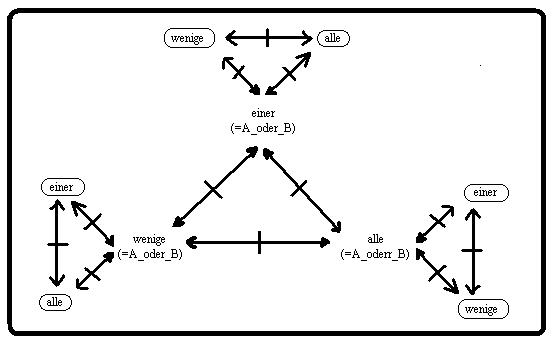 im politischen diskurs ist es üblich mit dem schema: 1, zu argumentieren, eine allgemeine verbindlichkeit ausgebeutend, die faktisch nicht gegeben ist. Wenn zwei sich über diesselbe sache streiten, dann ist die erfahrung geläufig, dass dasselbe objekt der gegenstand des disputs ist, präsent in zwei unterschiedlichen sichtweisen. Das ist, wie man sagt, eine binsenweisheit, die aber immer dann vergessen oder ignoriert wird, wenn einem bestimmten interesse der vorrang eingeräumt sein soll. Die bestimmtheit der relation: haus<==|==>polis, ist im horizont des ausgeschlossenen dritten moments festgelegt und dieses dritte moment ist eine relation, die einerseits exakt definiert ist, die aber andererseits immer zwei perspektiven präsent hält, die perspektiven des individuums als ich: A, und die perspektive des genossen: B, perspektiven, die auf das ding der welt, die relation: haus<==|==>polis, ausgerichtet ist, das, für sich mit sich identisch, in den zwei möglichen perspektiven verschieden erscheint.