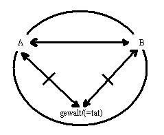 (a)lies: grooss A relationiert abhängig die gewalt schrägstrich in klammer gleich tat, die gewalt schrägstrich in klammer gleich tat relationiert abhängig grooss B.(b)es mag sein, dass das wiedererscheinen der wechselseitigen relation: A<==>B, verwunderung auslöst, weil der eindruck entstanden sein könnte, dass die gewalt/(=tat) nachrangig geworden sei. Das ist aber eine falsche interpretation. Manifeste gewalt kann die wechselseitige relation zerstört haben, weil das gewaltanwendende individuum als ich: A, oder der genosse: B, oder beide aus unterscheidbaren motiven gewalt üben und sich damit als ich selbst entmächtigt haben. Aus der perspektive des beobachtenden dritten: D, muss aber weiter behauptet werden, dass A und B ein ich sind und damit zueinander in einer wechselseitigen relation stehen(01). Der beobachtende dritte: D, selbst ein ich, muss, wenn er sich als ich begreifen will, voraussetzen, dass sowohl A als auch B, zu denen er eine wechselseitige relation hat, ein ich sind, auch dann, wenn der eine oder der andere oder beide gegeneinander gewalt üben(02).----------------