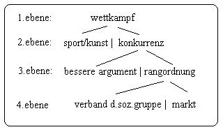 (+1)mit dem terminus: schöne künste, soll ein weites feld markiert werden, aber dieser aspekt wird en detail nicht erörtert.(+2)die differenz zwischen spiel und wettkampf(=sport) sollte behauptet werden, ebenso die differenz, die die konkurrenzkämpfe als eine eigenständige klasse ausweisen, geteilt in zwei unterklassen. (g/04/*5)<==//der terminus: konkurrenzkampf, bezeichnet die klasse von wettkämpfen, die weiter zu unterscheiden zweckmässig ist. Die eine unterklasse wird mit dem terminus: kampf um die rangordnung, bezeichnet, die andere unterklasse mit dem terminus: kampf ums bessere argument. Der kampf um die rangordnung in der gruppe(+1) kann mit offener gewalt geführt werden, wenn aber um das bessere argument gestritten werden soll(+2), dann ist jede form von offener gewalt ausgeschlossen,(+3).(*7)