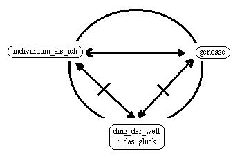 (*1)es ist ein irrtum, wenn der sogenannte reiche meint, er könne im ausleben seines reichtums als formen des glückes den armen vergessen - er kann in seinem bewusstsein den armen verdrängen, aber nicht auslöschen. (d/01)<==//der gedanke in einer graphik wiederholt. Die wechselseitige relation zwischen dem individuum als ich und seinem genossen ist auch dann real, wenn in der vermittlung durch das glück des einen oder des anderen das ding der welt: das glück, von beiden mit abhängigen relationen erfasst wird. Die relation: individuum_als_ich<==>genosse, ist äquivalent mit der relation: individuum_als_ich<==|==>(ding_der_welt:_das_glück)<==|==>genosse,(*1).(03)