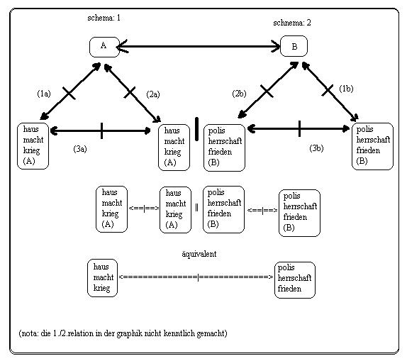 Die relation: A<==>B, in den perspektiven des A oder des B; der dicke strich markiert die trennung der schemata, die in der jeweiligen 3.relation manifest ist(g).