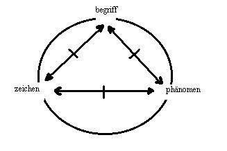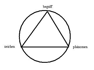 die grundform des modells ist ein dreieck, dessen eckpunkte mit den termini: "zeichen, begriff und phänomen" gekennzeichnet sind. Die drei elemente bilden in der theorie ein ganzes. Nichts kann diesem hinzugefügt noch diesem entzogen werden(1). Das theoretische problem ist, dass das semiotische dreieck als ein ganzes in sich zirkulär strukturiert ist. Damit ist jede aussage eines individuums als ich entweder eine tautologie oder die aussage ist zirkulär begründet. Das modell vermittelt keine objektive bedeutung, es sei, ein subjekt ordnet dem modell eine bedeutung zu. In der logik des modells ist das subjekt ein element des modells, aber das subjekt erscheint in der konstruktion des modells weder als ein element des modells, noch ist das subjekt als element in der konstruktion ausgewiesen. Vom modell geht unbestritten eine faszination aus, aber die faszination verschwindet, wenn das modell einer kritischen analyse unterworfen wird; denn wenn das individuum als ich als element des system einbezogen wird, dann erscheint ein anderes resultat und das ist etwas anderes. Diese differenz darf nicht unterschlagen werden. Das modell: das semiotische dreieck, ist ein mittel zum zweck, nicht aber der zweck selbst, und die form, die gegenstand des trialektischen modus ist, sollte nicht mit der theorie verwechselt werden, die in der semiotik methodisch verortet ist.
