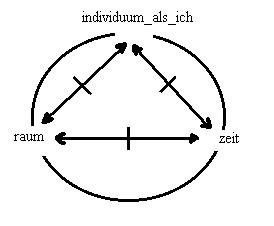 die tradition setzt raum und zeit als gegeben voraus. Das ist aber eine selbsttäuschung; denn das individuum als ich, das den moment seiner gelebten gegenwart lebt, kann nicht simulieren, dass es eine zeit und einen raum gibt, wenn es selbst in raum und zeit nicht ist. Die zeit und der raum als postulat ist dagegen eine annahme, die das individuum als ich im moment seiner gelebten gegenwart denken kann, aber das ist ein gedanke in raum und zeit, der als beweis genau das voraussetzen muss, was er beweisen soll. <==//