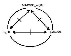 Zusatz: in der kommunikation des individuums als ich: A, mit dem genossen: B, über das ding der welt: k, erscheint die wechselseitige relation: A<==>B, mit den abhängigen relationen: A<==|==>k und k<==|==>B, relationen, die im ding der welt: k, als dem ausgeschlossenen dritten moment ihr verknüpfendes moment haben. Als horizont in der wechselseitigen relation: A<==>B, erscheint diese verknüpfung transformiert in der abhängigen relation: A<==|==>k'<==|==>B, deren vermittelndes moment: k', nicht mit dem ding der welt: k, identisch ist. Es ist also eine frage der perspektive, ob in der situation der kommunikation die wechselseitige relation** fokussiert werden soll oder die abhängige***. Die differenz ist nicht aufhebbar****.