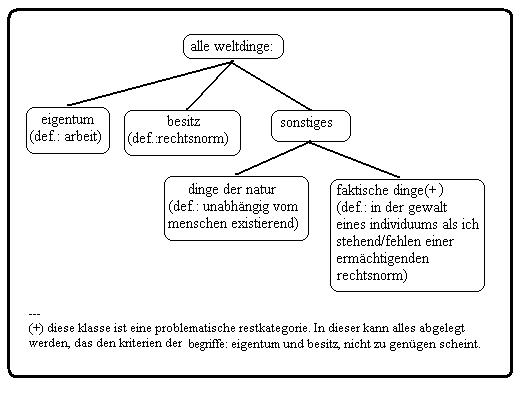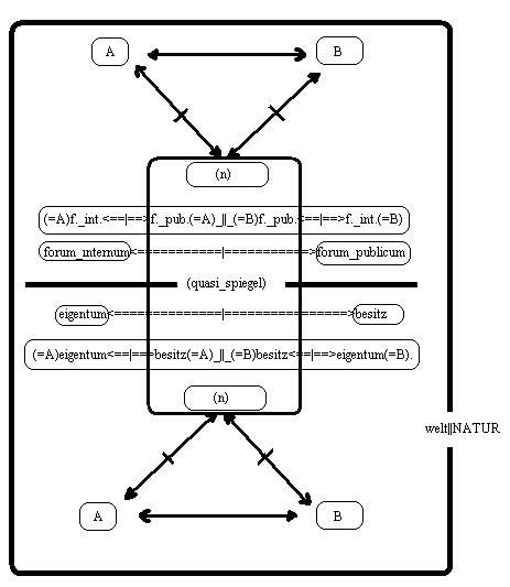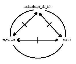 das problem ist die gedoppelte kodierung der relationen: "individuum_als_ich<==|==>ding_der_welt(=sache):_n, und genosse<==|==>ding_der_welt(=sache):_n,"(+1). Einmal kann das relationszeichen: <==|==>, das eigentum an der sache: n, anzeigen, dann den besitz der sache: n. In bestimmten situationen können diese relationen zusammenfallen, aber sie fallen in keinem fall identisch, weil sowohl der genosse als auch das individuum als ich in jedem moment ihrer gelebten gegenwart entweder die eine oder die andere relation im horizont des ausgeschlossenen dritten moments behaupten können. In der analyse können die fallkonstellationen sauber von einander getrennt werden, in der synthese aber, wenn sich das individuum als ich und sein genosse um die sache: n, wie die kesselflicker streiten, ist nichts klar(+2).----<==//