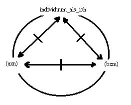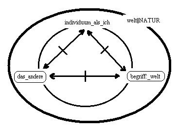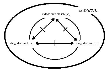 (a)der graphik ist das zeichen für die welt hinzugefügt.(b)es ist nicht zulässig, den terminus: individuum als ich, auf den terminus: individuum, zu verkürzen. Das sind zwei unterscheidbare zeichen, die jeweils anderes bezeichnen, einen begriff oder ein phänomen - tertium non datur.(2.4.010/(d/01))<==//