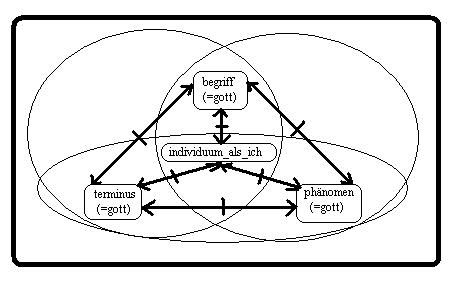 der gedanke im argument: 2.4.003/(b), in einer graphik wiederholt(a). Die momente: "begriff(=gott), phänomen(=gott) und terminus(=gott)" sind mit den denkbaren relationen in einem schema überschaubar verknüpft, komplex aber sind die relationen zueinander strukturiert, wenn das moment: das individuum als ich, in das argument einbezogen wird. Es sind drei schemata real, die nicht identisch fallen können.=========================Schema: 1 (ausgangsschema)
