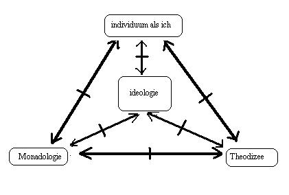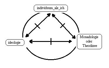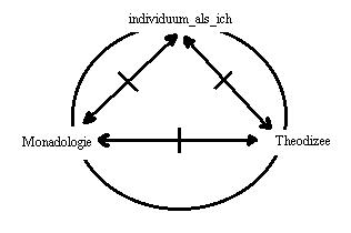 Es ist das individuum als ich, das im kontext seiner grundentscheidung(=ideologie) die relationen setzt, entweder zum text der Monadologie oder zum text der Theodizee. Jede relation ist für sich wahr und für das individuum als ich gültig. Mit seinen setzungen ist aber auch die relation: monadologie<==|==>theodizee, gesetzt, die in raum und zeit ein vielfältiges aussehen hat, das immer ein ansatzpunkt für unterscheidbare deutungen ist. Im trialektischen modus ist die struktur der rezeption erkennbar, in der das individuum als ich, mitglied in einer konsensgemeinschaft, den philologisch gesicherten text als dokument der historia zur kenntnis nimmt und dieses dokument der historia als text deutet(a). Für den gläubigen muss es wie ein verstörender schock wirken, wenn der geglaubte gott mit gründen als der urheber des guten und des bösen präsent ist, für den wissenden aber ist es nicht nachvollziehbar, dass das sein, gesetzt als zureichender grund, zwei konsequenzen haben soll und haben muss(b), die nur als widersprüche begreifbar sind, aber in raum und zeit als gegensätze immer wieder erlebt und gelebt werden. Es muss die einsicht in die struktur genügen, weil jeder konkrete fall nur die entscheidung eines individuums als ich sein kann, das autonom sich entscheiden muss, sich entscheidet und in seiner entscheidung absolut sich selbst gebunden hat(c).