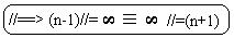 , für unendlich eingeschlossen(g), kann nicht mehr, aber auch nicht weniger ausgesagt werden als dies: jede zahl: n, hat die zahl: (n+1), zum nachfolger und die zahl: (n-1), zum vorgänger. Es sind erwägungen der praxis, die zahlreihe mit der zahl: (n+1) zu schliessen, es ist allgemeine praxis, das zahlzeichen: (n+1), durch das zeichen: