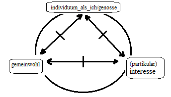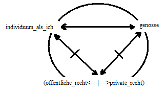 In der graphik: 03, sind zwei schemata zusammengefasst, die nicht identisch fallen können, zum ersten das schema: das individuum als ich, zum zweiten das schema: der genosse. Die situation präsentiert sich als komplex, wenn die wechselseitige relation: individuum_als_ich<==>genosse, in die betrachtung einbezogen wird und die relation: öffentliche_recht<==|==>private_recht, der gemeinsame gegenstand ist.