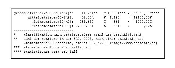 (f) siehe: subtext: 1.02 *. Die mittelbetriebe bringen es auf 19105 Euro, kleinbetriebe(10-49) auf 1992 Euro und kleinstbetriebe auf 0,27 Euro pro fall. Die statistisch kleinen zahlen von 1992 und 0,27 Euro pro betrieb dürften ihren grund darin haben, dass die finanzämter faktisch die steuererklärungen der kleinstbetriebe nicht prüfen, und die der kleinbetriebe nur in grossen zeitabständen. Der grund ist personalmangel in den finanzämtern. Es kann unterstellt werden, dass dieser mangel politisch gewollt ist; denn in den berichten über steuerprüfungen wird immer wieder darauf verwiesen, dass die prüfer "ihr geld" wert seien. Und warum geschieht hier nichts? und wenn doch etwas geschieht, dann machen die damen/herren politiker der Berliner Republik, den staat wieder schlanker, vulgo, sie stellen die amtsstellen auf kw - künftig wegfallend. Es ist daher ein verzerrtes bild, wenn bei den groossbetrieben ein so grosser betrag statistisch herauskommt, weil hier die kontrolldichte der finanzämter dichter ist. <==//