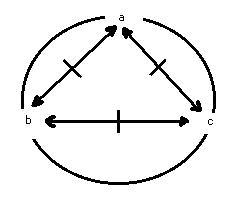 Der trialektische modus umfasst drei momente: "a, b und c"(02). Jeweils zwei momente sind in einer relation abhängig miteinander verbunden, jede für sich: "a<==|==>b, a<==|==>c und b<==|==>c"(03). Die momente: "a, b und c" sind gleichrangig und können als eckpunkte eines gleichseitigen dreiecks und als punkte auf einer kreislinie interpretiert werden. Das dreieck und der kreis haben einen imaginierten, aber realen mittelpunkt(04). Jede der drei möglichen relationen ist im horizont des jeweils ausgeschlossenen dritten moments bestimmt(05). Diese konstruktion ist zerstört, wenn ein moment entfernt oder ein weiteres hinzugefügt wird.