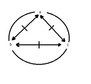 Der begriff: der trialektische modus, hat drei elemente: "a, b und c", die in drei abhängigen relationen miteinander relationiert sind. Die verknüpfung der drei relationen kann in seiner abstrakten form als ein dreieck dargestellt werden, dessen eckpunkte auch als punkte auf einem kreis interpretiert werden können(2)(graphik: 1). Es soll gelten, dass erstens das individuum als ich in der funktionsstelle: a, eingesetzt wird, zweitens dass jedes ding der welt: n, als teil der welt in der funktionsstelle: b, eingesetzt werden kann, und dass drittens die welt als ein ganzes in der funktionsstelle: c, einzusetzen ist(3)(graphik: 2). Die konstitutiven elemente: "a, b und c" oder: "das_individuum_als_ich, das_ ding_der_welt:_n und die_welt_als_ganzes" sind gleichrangig. Was in den wertordnungen eines individuums als ich einen vorrang des einen oder anderen weltdinges indizieren mag, das ist im begriff: der trialektische modus, gegenstandslos; denn die konstruktion fällt in sich zusammen, wenn ein element aus diesem schema herausgestrichen oder einem element ein vorrang vor den anderen eingeräumt würde.
