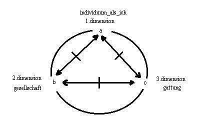 die struktur des begriffs: der trialektische modus, ist analog mit den regeln der allgemeinen systemtheorie beschreibbar. Drei elemente: "a, b und c", sind in drei abhängigen relationen miteinander relationiert(5). Die verknüpfung der drei relationen kann in seiner abstrakten form als ein dreieck dargestellt werden, dessen punkte auch als punkte auf einem kreis interpretiert werden können(11)(11.1). Es soll gelten, dass erstens das individuum als ich in der funktionsstelle: a, eingesetzt wird, zweitens dass jedes ding der welt: n, als teil der welt in der funktionsstelle: b, eingesetzt werden kann, und dass drittens die welt als ein ganzes in der funktionsstelle: c, einzusetzen ist(11.2). Die konstitutiven elemente: "a, b und c" oder: "das_individuum_als_ich, ding_der_welt:_n und die_welt_als_ganzes" sind gleichrangig. Was in den wertordnungen eines individuums als ich einen vorrang des einen oder anderen weltdinges indizieren mag, das ist im begriff: der trialektische modus, gegenstandslos; denn die konstruktion fällt in sich zusammen, wenn ein element aus diesem schema herausgestrichen oder einem element ein vorrang vor den anderen eingeräumt würde.(abs.:1.2.21a)Was in der abstrakten form eindeutig erscheint, das ist in den konkreten formen verwickelter, weil der konsens gültig ist, dass dem individuum als ich in seiner welt eine besondere stellung zukommen soll, die so gedeutet wird, dass dem individuum als ich ein vorrang zuzukommen scheint. Der schein eines vorrangs des individuums als ich ist darin begründet, dass dem element: das individuum als ich, das merkmal zugeordnet ist, das movens in der konstruktion zu sein, dem die funktion zukommt, die dinge der welt mit der welt als das ganze zu verknüpfen. Im moment seiner gelebten gegenwart ist das individuum als ich eindeutig bestimmt, die relationen aber, die das individuum als ich einerseits unmittelbar mit den dingen seiner welt konstituiert und andererseits mittelbar zwischen den relationierten dingen der welt konstruieren muss, sind in raum und zeit optionen des individuums als ich, mit denen es die dinge der welt verknüpft, die das sind, was sie sind, aber als das erscheinen, was das individuum als ich in den relationen erfasst. Was das ding der welt: n, für das individuum als ich ist, das hat es in der relation zu diesem bestimmten ding der welt: n, präsent. Als ding der welt ist das ding der welt: n, ein teil der welt, die das individuum, das ein ich ist, als ganzes denkt. Die welt als ganzes, die das individuum als in einer relation präsent hat, ist aber als vorstellung dieses individuums als ich nur ein ding seiner welt, wie jedes andere weltding dieser welt auch. Im moment der gelebten gegenwart hat das individuum als ich entweder die relation zu den bestimmten ding der welt: n, oder die relation zu dem bestimmten ding der welt: die welt als ganzes, präsent, die jeweils im horizont des ausgeschlossenen dritten moments bestimmt sind. Die relation zwischen den dingen der welt: das_ding_der_welt:_n<==|==>die_welt_als_ganzes, die das individuum als ich in den unterscheidbaren relationen zu dem ding der welt: n, oder dem ding der welt: die welt als ganzes, konstruieren kann, ist im horizont des ausgeschlossenen dritten moments, das individuum als ich, bestimmt und wird vom dem individuum, das ein ich ist, als ein ding der welt wahrgenommen und reflektiert, das zwar viel mit den dingen der welt: "das ding der welt: n, oder das ding der welt: die welt als ganzes" gemein haben kann, aber weder in dem einen noch in dem anderen ohne rest aufgeht. Die elemente: "a, b und c" oder: "das_individuum_als_ich, das_ding_der_welt:_n, und die_welt_als_ganzes" sind in ihren möglichen positionen eindeutig definiert, in raum und zeit aber erscheinen sie dem individuum als ich in jedem moment seiner gelebten gegenwart anders. Die struktur seiner existenz, die das individuum als ich im abstrakten schema fixiert präsent hat, ist für das individuum als ich in raum und zeit dann wirklich, wenn es auf dem weg sein leben lebt, in dem der anfang seiner existenz in der geburt mit dem ende seiner existenz im physischen tod verbunden ist. Dieser begriff: existenz oder das leben des individuums als ich, ist für das individuum, das ein ich ist, nur dann denkbar, wenn es diese existenz in raum und zeit vernünftig realisieren kann, aber was für das individuum als ich vernünftig ist, darüber entscheidet es autonom, und diese entscheidung kann dem individuum, das ein ich sein will, weder genommen werden, noch kann das individuum, das ein ich ist, sich dieser entscheidung entledigen.(abs.:1.2.21b)