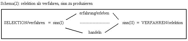 wiederholung des gedankens: 2.22.45/(b/2). Luhmann's begriff: reduktion von komplexität, ist in zwei schemata darstellbar. Das schema(1) hat die differenz: welt/system, zum gegenstand. Der gegenstand des schema(2) ist das verfahren der reduktion von komplexität, von Luhmann mit dem terminus: selektion, gekennzeichnet.2.24.19