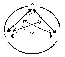 in der form einer 4.relation sind im trialektischen modus drei relationen logisch möglich. Die denkbare relation: ding_der_welt:_n<==|==>(individuum_als_ich:_A<==>genosse_B), fällt aber aus, weil das ding der welt: n, in keinem fall die rolle des beobachters übernehmen kann.3.schema: