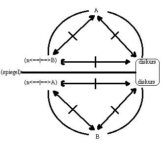 Die schemata: 1 und 2, werden interpoliert vorgestellt; mit der andeutung des spiegels können sie so in einer graphik verknüpft werden. Das moment: diskurs, gilt als identisch, die relationen: n<==|==>B und n<==|==>A, sind als momente der relationen nicht identisch.---