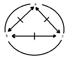 (1) um die komplexität der graphik nicht zu erhöhen erscheint die abhängige relation: <==|==>, als einfacher strich, die momente der relationen werden nur einfach mit den buchstaben: "a, b und c" gekennzeichnet, die verschiedene dinge der welt repräsentieren. An der seite ausserhalb der schemata sind die stufen der analyse: 1 bis 3, notiert. Der schmale strich markiert die schemata des trialektischen modus, der starke strich die absolute grenze: welt||NATUR.Die relationen im schema 1: