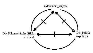 (a)der zusammenhang der Nikomachischen Ethik und der Politik, ergänzt um die bereiche: politik und ethik, ist so(=grundform) im trialektischen modus darstellbar. Die momente: "Nikomachische Ethik(=ethik), Politik(=politik) und das individuum als ich".(b)