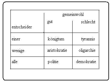 (a)es könnte gefragt werden, warum Ich mich so gewunden ausdrücke, und die frage wird mit gutem grund gestellt, mein grund aber ist simpel. Wenn in einem diskurs der staat als gegenstand des diskurses erscheint und wenn bei dieser gelegenheit auch auf die meinung des Aristoteles bezug genommen wird, dann wird es nicht vermeidbar sein, das berühmte schema zu zitieren. Es ist eine frage der praxis, wenn der kerngedanke des schema in dieser konstellation der dinge paraphrasierend wiederholt wird. Ob dem kerngedanken in seiner wiederholung noch etwas neues hinzugefügt werden kann oder hinzugefügt werden soll, das ist eine frage der perspektive, also eine meinung, der andere meinungen beigesellt sein können. Mit diesem obiter dictum werde Ich diesen aspekt beiseite stellen. (a)<==//(b)der rezipient meines arguments wird, für sich selbst gültig, entscheiden, ob meine reflexionen über Aristoteles der sache neue perspektiven geöffnet haben. (b)<==//(c)das schema des Aristoteles wiederhole Ich in einer tabelle, die Ich als angemessene darstellung seiner erläuterungen ansehe(01). Die totalität aller denkbaren staatsformen(02) erfasst Aristoteles mit zwei kriterien, die er noch einmal unterscheidet. Zweigeteilt ist das eine kriterium, das andere dreigeteilt. Folglich kann es nur sechs formen der staatlichen organisation geben. Das erste kriterium ist das gemeine wohl aller, das entweder erreicht wird(=gut), oder verfehlt ist(=schlecht). Das zweite kriterium ist auf die zahl derjenigen begrenzt, die befugt sind über die dinge des staats zu entscheiden, die alle betreffen; das können sein, entweder einer(=könig), oder wenige(=die besten) oder alle(=das volk). In der tabelle sind die möglichen staatsformen in der terminologie des Aristoteles zusammengefasst(03).(d)