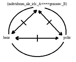 Der begriff: das haus, definiert die bedingung(v), die faktisch gegeben sein muss, wenn das individuum als ich und sein genosse, zueinander notwendig ungleich, sich als gleich in ihrer wechselseitigen relation erfahren wollen(w). Diese erfahrung der gleichheit können der genosse und das individuum als ich nicht in den institutionen der gesellschaft machen, die zusammenfassend mit dem terminus: das haus(oikos), bezeichnet werden, eine erfahrung, die das individuum als ich und sein genosse nur in dem raum machen können, der mit dem terminus: polis, bezeichnet wird(x).