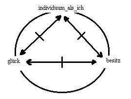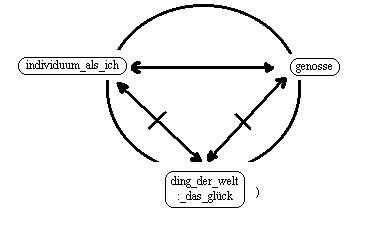 es ist ein irrtum, wenn der sogenannte reiche meint, er könne im ausleben seines reichtums als formen des glückes den armen vergessen - er kann in seinem bewusstsein den armen verdrängen, aber nicht auslöschen.der gedanke in einer graphik wiederholt. Die wechselseitige relation zwischen dem individuum als ich und seinem genossen ist auch dann real, wenn in der vermittlung durch das glück des einen oder des anderen das ding der welt: das glück, von beiden mit abhängigen relationen erfasst wird. Die relation: individuum_als_ich<==>genosse, ist äquivalent mit der relation: individuum_als_ich<==|==>(ding_der_welt:_das_glück)<==|==>genosse,(*1).(03)