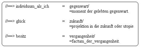 (01)Historisches Wörterbuch der Philosophie: stichwort: glück, glückseligkeit. Bd.3, sp.679-707(Robert Spaemann). bibliographie/ //==>2.93.48(02)Richter,Ulrich: Die begriffe: eigentum und besitz, im trialektischen modus. 016:eigentum. bibliographie/ //==>2.93.49. (g)<==//die wiederholung des gedankens in einer graphik. Die einbindung des gedankens ist klarer fassbar, wenn die beziehungen zwischen den momenten: "das individuum als ich, sein glück und der besitz desselben" in einer graphik gefasst werden. Das zugrundeliegende argument ist die zeiterfahrung im trialektischen modus(01). Im moment: gegenwart, ist immer das individuum als ich einzusetzen. Im moment: zukunft, können die momente: "projektion in die zukunft, oder glück, oder utopie" eingesetzt werden und im moment: vergangenheit, die momente: factum der vergangenheit und besitz(02).(i)